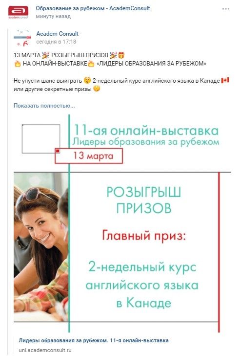 1.2. Акция – розыгрыш призов на 11-й выставке "Лидеры образования за рубежом", проводимый в порядке и на условиях, определяемых настоящими Правилами, в целях продвижения услуг агентства по обучению за рубежом AcademConsult, привлечения внимания и поддержания интереса существующей и потенциальной аудитории.
